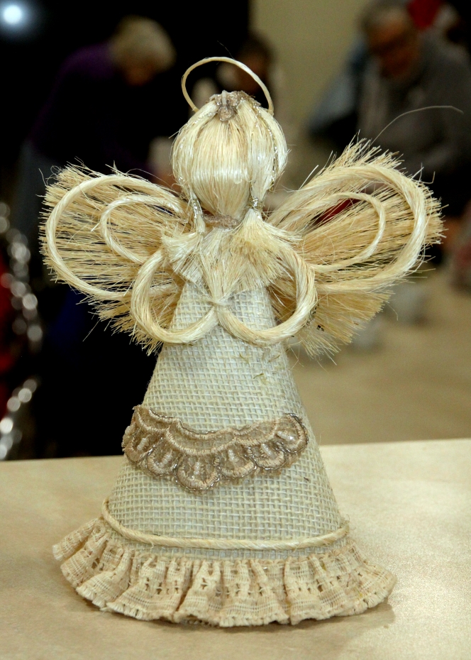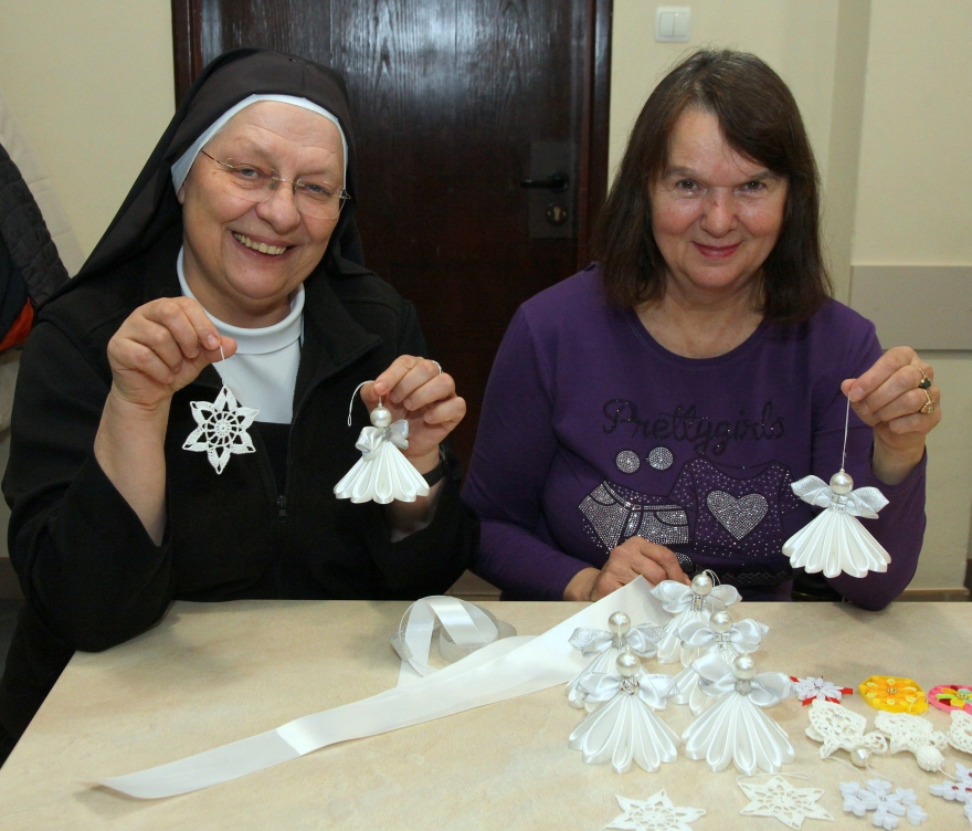 W tym radosnym oczekiwaniu na przyjście Jezusa Chrystusa panie robiły ozdoby świąteczne. Maria Bilska wykonała aniołki ze zwykłego sznurka, który rozplątuje się na pojedyncze niteczki, dopasowuje główkę i wiąże się tak, aby powstała cała postać. Dzieliła się również instrukcją jak wykonać gwiazdki i bombki. - Potrzebna jest nitka bawełniana, mocno merceryzowana, jest to technika zwana frywolitką. Robi się to przy pomocy jednego lub dwóch czółenek. Praca jest bardzo żmudna, nie wolno popełnić błędu, a jeśli się zdarzy, nie prujemy jak przy pracach szydełkowych, ale musimy odciąć nitkę i następną wprowadzić odpowiednią techniką. Można robić także z nitek metalizowanych. Bombki wykonane taką nitką są świecące i dają bardzo ładny efekt.