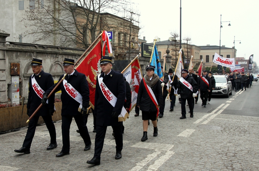 Pochód uformowany z pocztów sztandarowych i uczestników uroczystości przeszedł ulicą Sienkiewicza pod „Pomnik – Krzyż” Pamięci Ofiar Stanu Wojennego o Godność Człowieka przy kościele pw. Świętego Krzyża.
